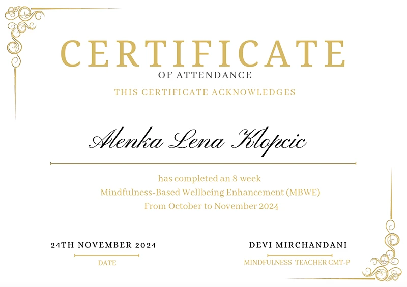 Bilo mi je izjemno prijetno; s pogovori smo se dotikale pomembnih življenjskih vprašanj in tem. Vzdušje je bilo izjemno sproščeno in zato smo se tudi vse udeleženke izjemno lepo vključile in sodelovale v naših srečanjih. Bravo, Alenka, lepo si nas vodila skozi delavnice! Priznati moram še, da 'se me je precej prijelo' glede prehrane, dihanja, meditacije in nasploh iskanja notranjega ravnovesja, ki mi prinaša zadovoljstvo.
